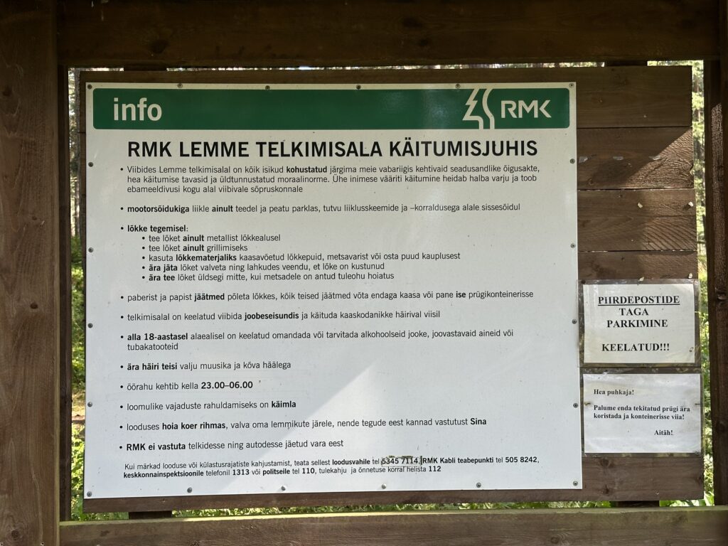 Teel Pärnusse, peatusin huvi pärast RMK Lemme telkimisalal. RMK telkimisalal peatumine, oli minu jaoks esmakordne ja jättis vägagi positiivse mulje. Karavaniga telkimisalale sisenemine maksis 5 eurot ja seda tasudes, võis telkimisalal peatuda kasvõi kuu või rohkem. Reegel oli selline, et kui telkimisalalt karavaniga välja sõidad, siis uuesti sisenemisel, pead uuesti 5 eurot maksma. Soovitan enne telkimisalale sisse sõimist, käia sees vaatamas, kas sobivaid vabu parkimiskohti on (parkimiskoha pead ise valima ja keegi ei tule seda kätte näitama), sest suure autoga seal tühja manööverdamine, ei ole just mugav nendes suhteliselt kitsastes tingimustes. Telkimisalal oli palju kuivkäimlaid ja oli ka maja, kus said väikse tasu eest vajadusel dušši all käia. Parkimiskohad olid varustatud pinkidega ja lõkkekohtadega, mida oli terve metsaalune täis ehitatud aga siiski piisava vahemaaga, et peatuvad seltskonnad teineteist ei segaks. See on õige koht nendele, kellele meeldib ilus männimets ja liivane mererand. Kindalsti lähen sinna tagasi.